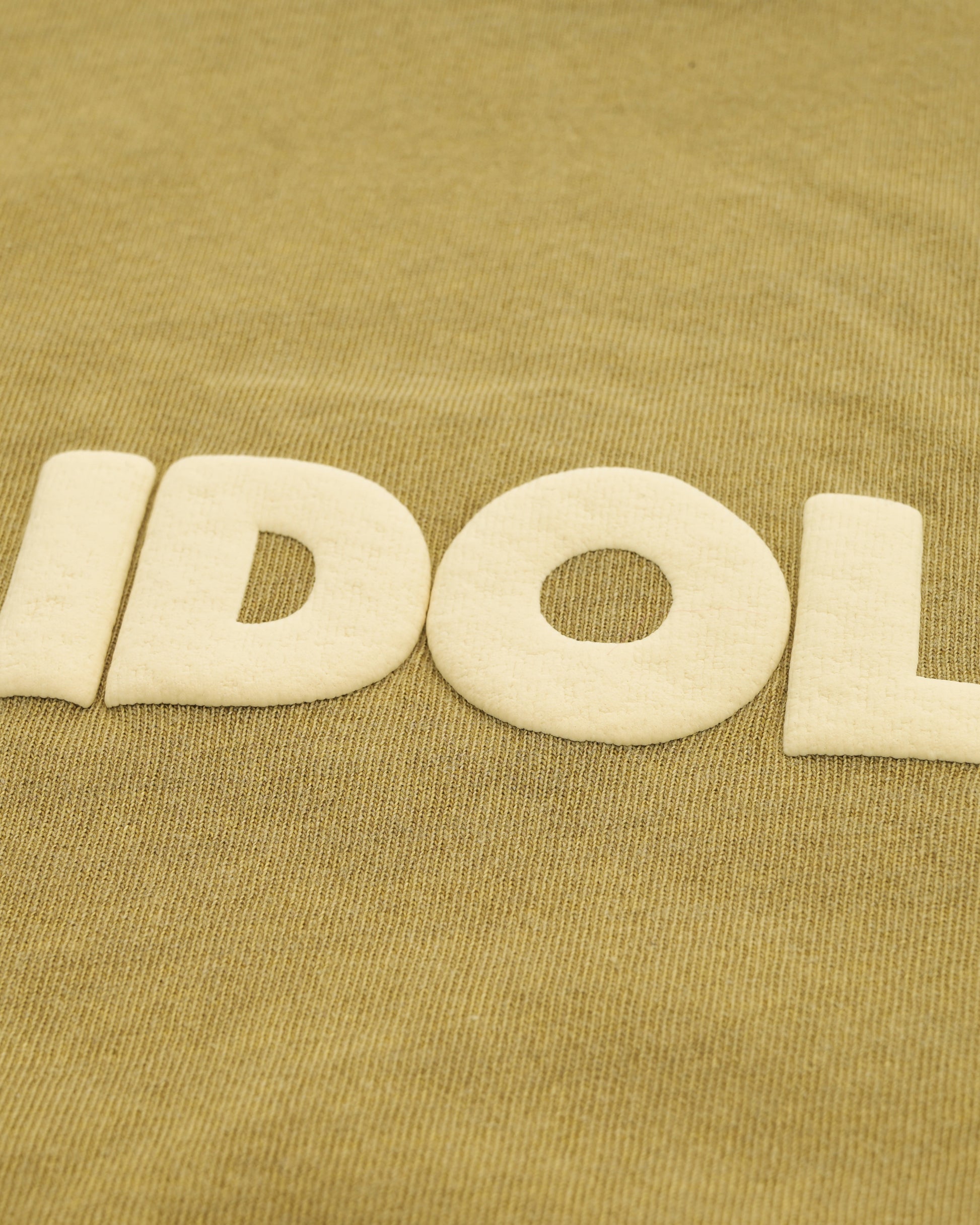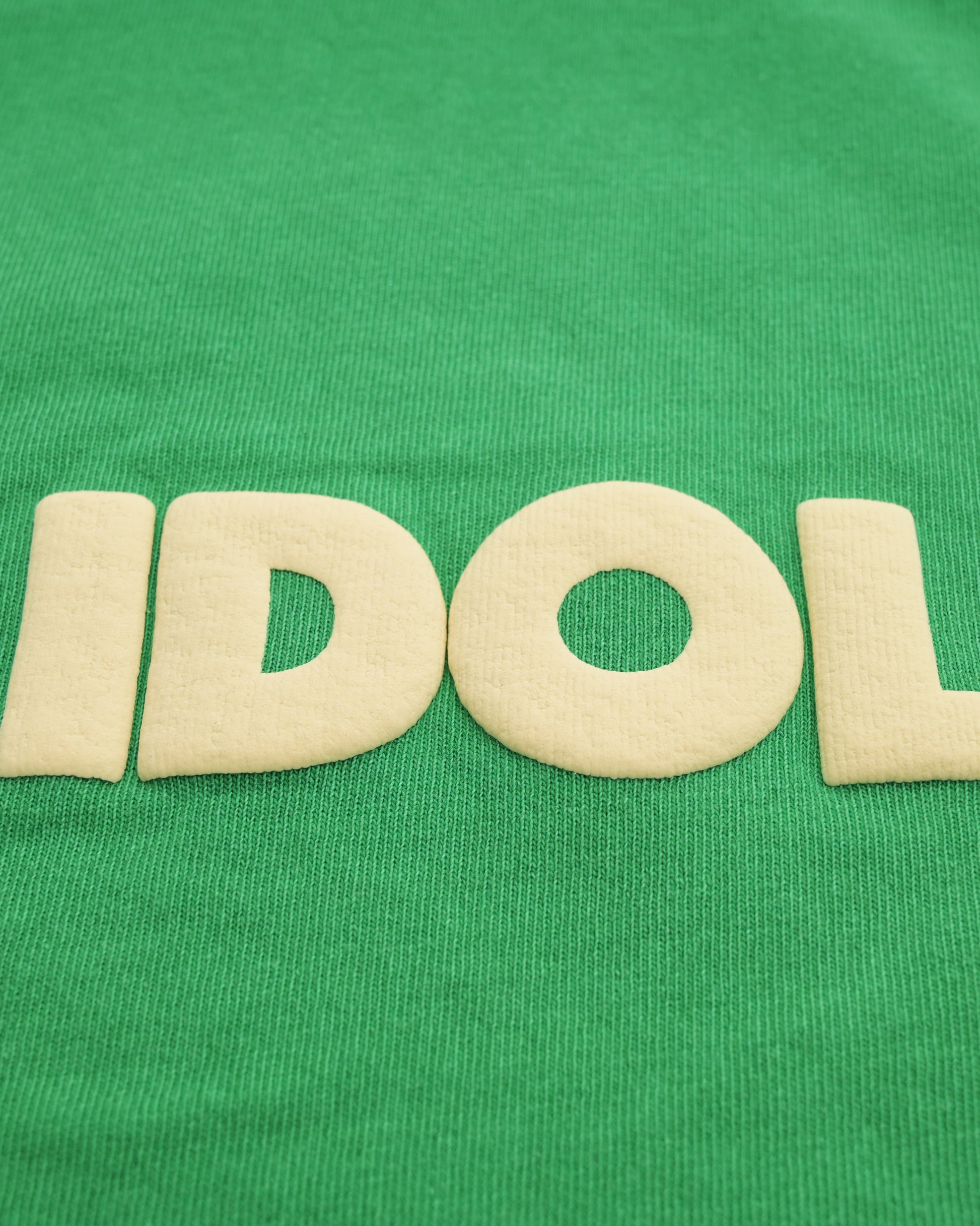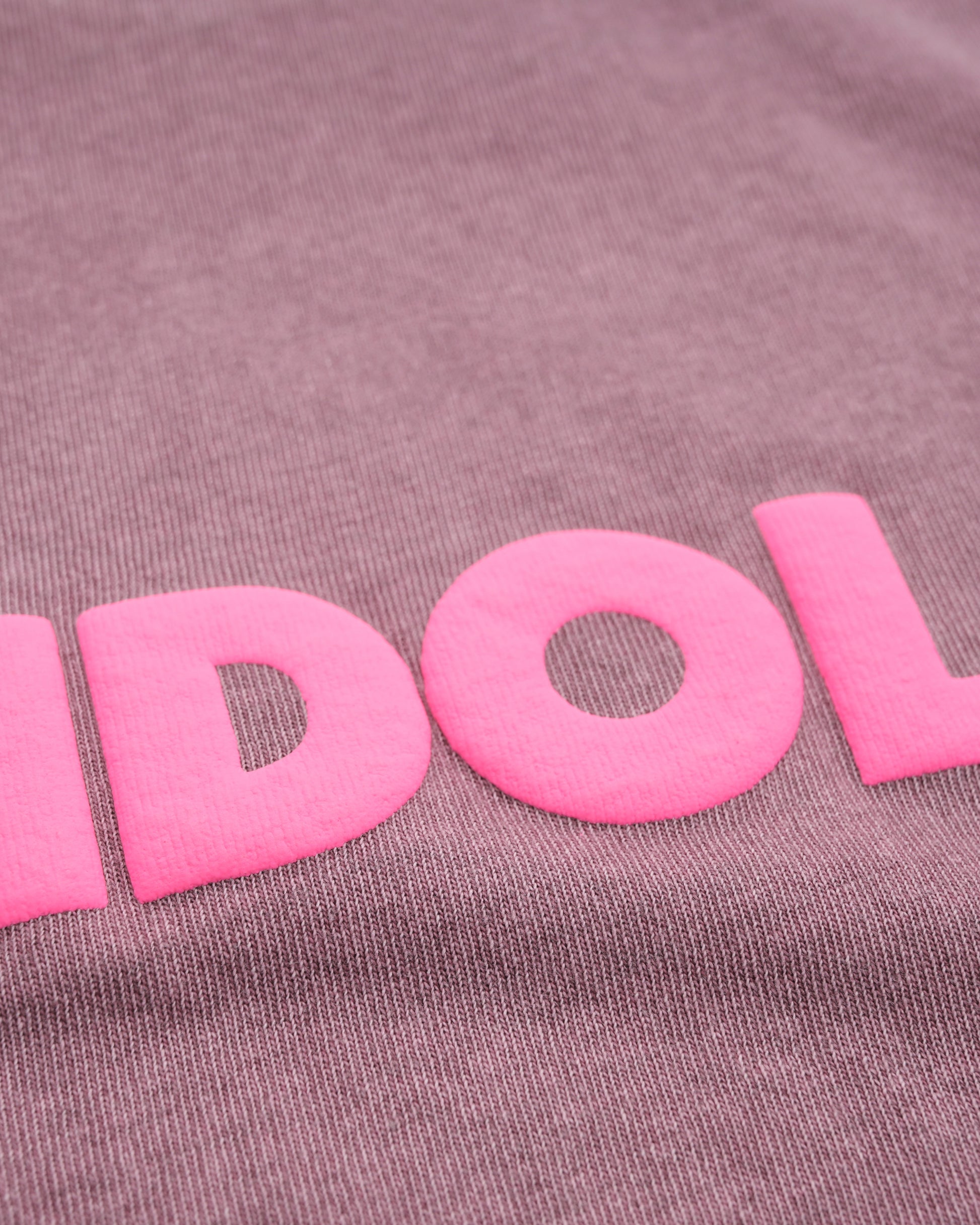 ピグメントダイ(製品染め加工)を施した雰囲気の出たカラーリングに厚盛りの発泡プリントでIDOLと入ったリラックスフィットシルエットのTシャツ。COTTON100% ※モデル170cm S着用 ※こちらの商品は製品染めの商品のため、洗濯するも他の衣類に色移りする可能性がございますので、お洗濯の際は単体で洗濯機に入れてください。